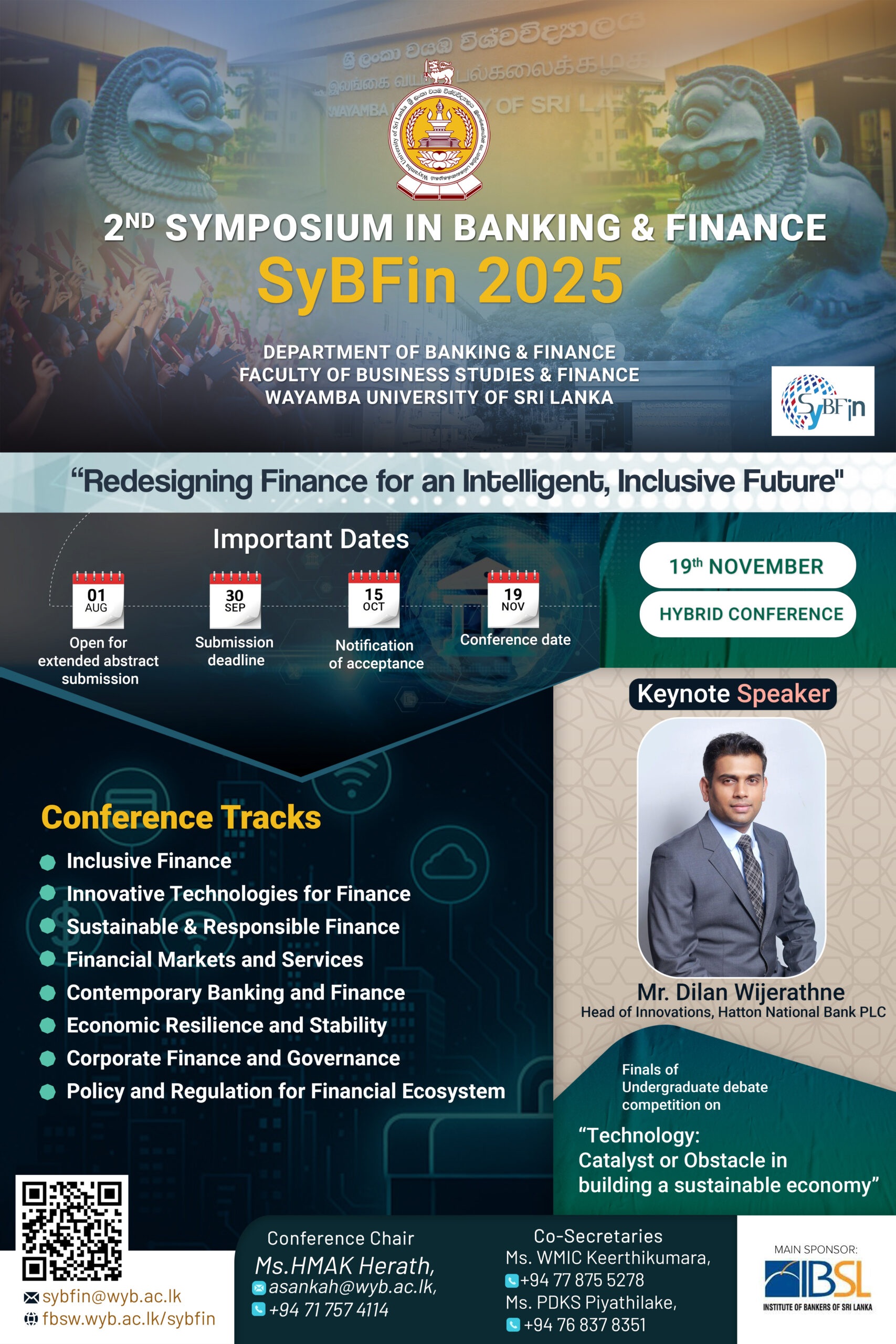 We are pleased to inform you that the submission of Extended Abstracts for the Research Symposium “SyBFin 2025”, organized by the Department of Banking & Finance of the Wayamba University of Sri Lanka, is now open. We warmly invite you to submit your extended abstracts in accordance with the guidelines stipulated by the University.